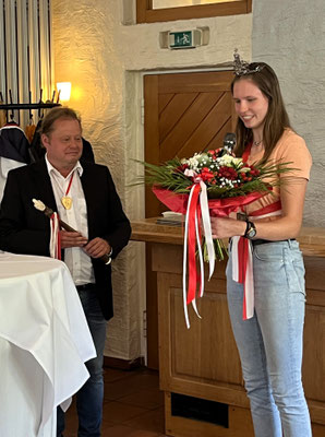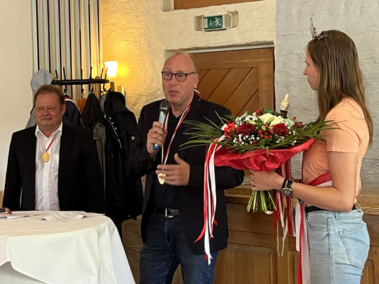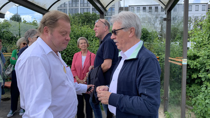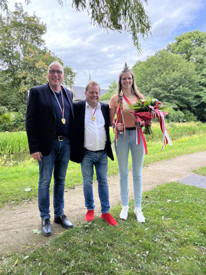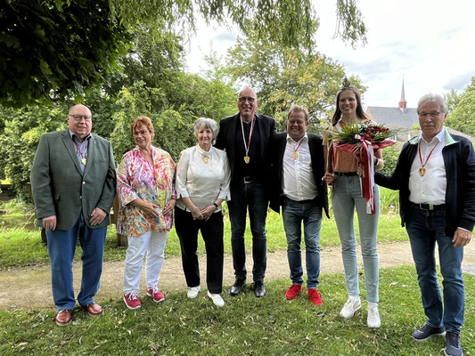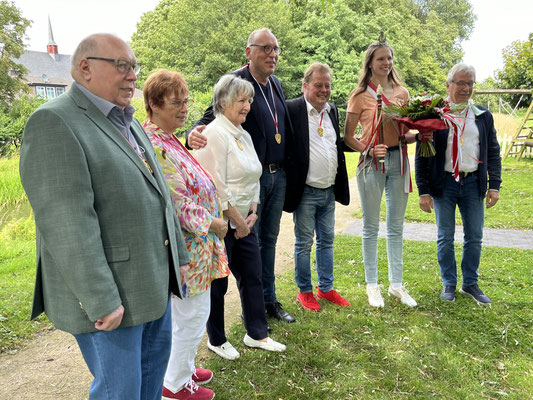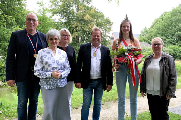 Der Ehrenrentmeister Hermann Oeckinghaus, die Ehrenrentmeisterin Marianne Lauhof, die Ehrenrentmeisterin Hildegard Eul, der neue Ehrenrentmeister Werner Schenzer, der Ehrenrentmeister Dr. Ingo Tenberg, die Pumpenmarie Jana Schumann und der Ehrenrentmeister Walter Hoffacker